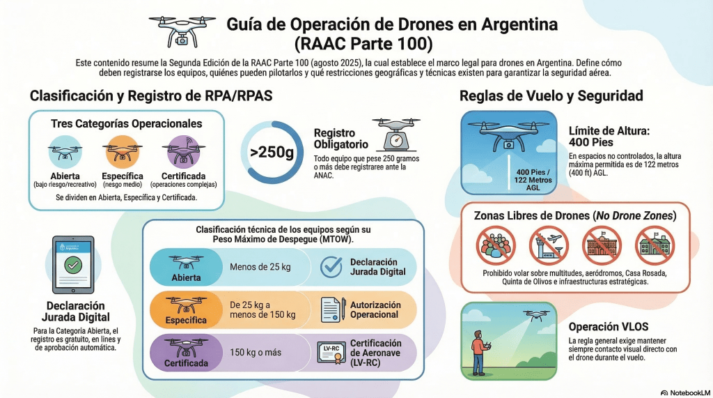 Entonces, para cerrar la idea, para operar legalmente en la Categoría Específica, es obligatorio obtener el Certificado de Explotador (CETA), lo cual exige la presentación y aprobación de un Manual de Operaciones (MOE) y un Sistema de Gestión de Riesgos (SGR). Asimismo, el piloto al mando debe poseer una licencia aeronáutica de piloto a distancia y un certificado de aptitud médica (CMA Clase 3) vigentes, mientras que el drone debe estar inscripto en el Registro Nacional de Aeronaves para ostentar su matrícula LV-R. Finalmente, se debe contar con un seguro de responsabilidad civil por daños a terceros y realizar una declaración operacional previa para cada vuelo, coordinando con la autoridad si se ingresa en espacios controlados o restringidos