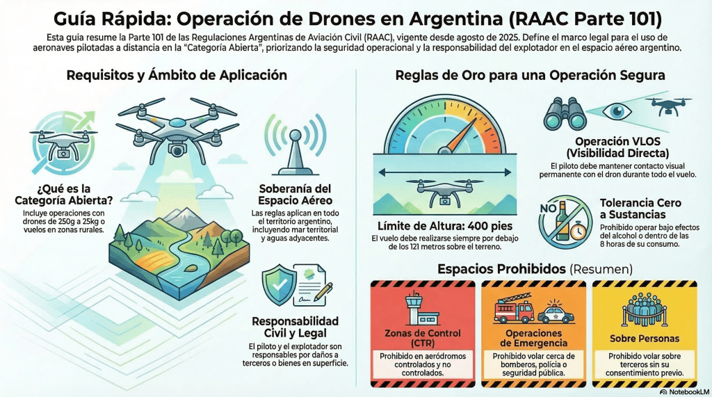 Si la RAAC 100 define qué es un drone dentro del sistema aeronáutico, la RAAC 101 explica cómo se debe volar para la Categoria Abierta. Acá aparecen las reglas operativas que probablemente más escuchaste.